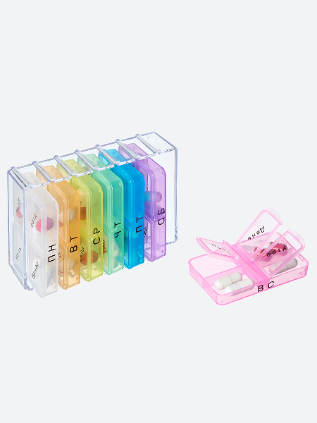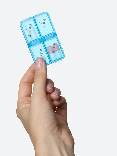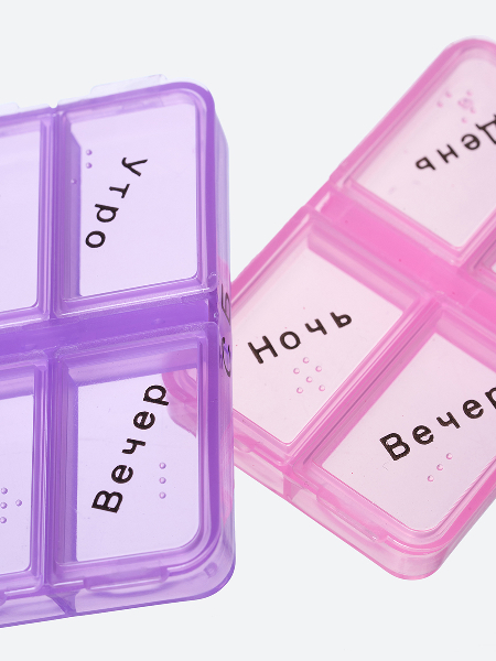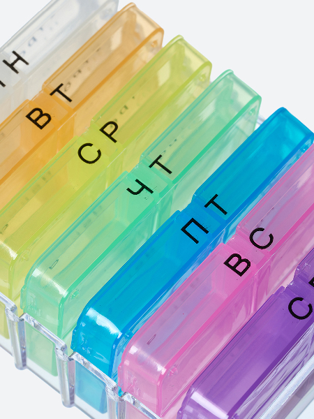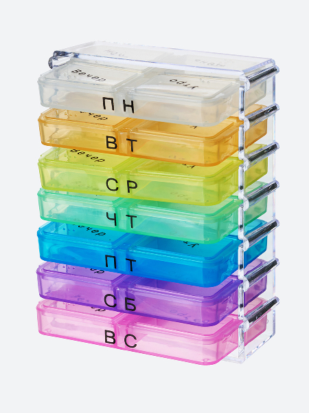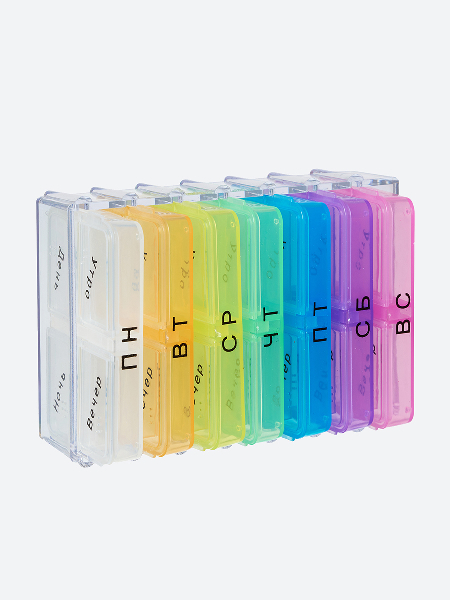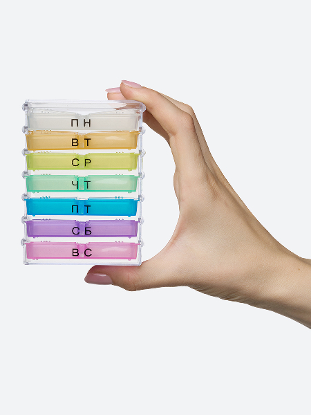 В контейнере 7 съемных пеналов разного цвета, прозрачных – на каждый день недели, в пенале 4 отделения на утро, день, вечер и ночь. Дни недели маркированы на пеналах.