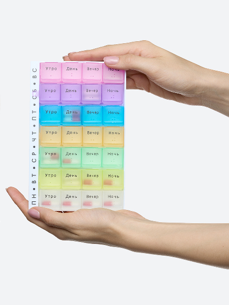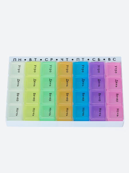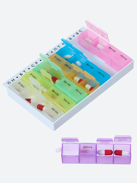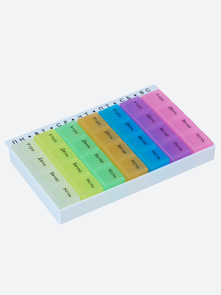 В контейнере 7 съемных пеналов разного цвета, прозрачных – на каждый день недели, в пенале 4 отделения на утро, день, вечер и ночь. Дни недели маркированы на контейнере.