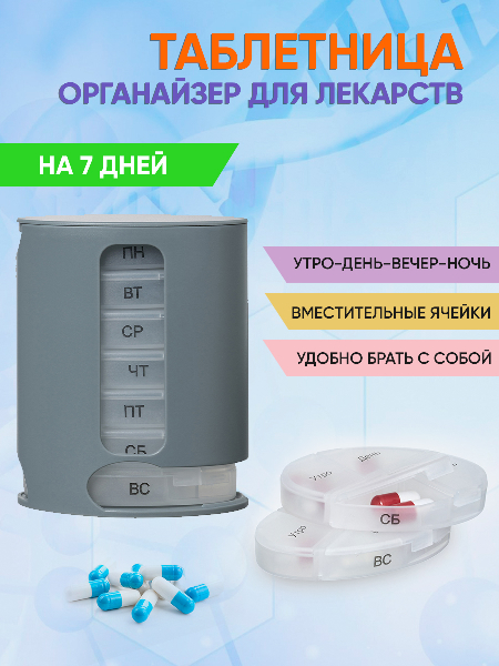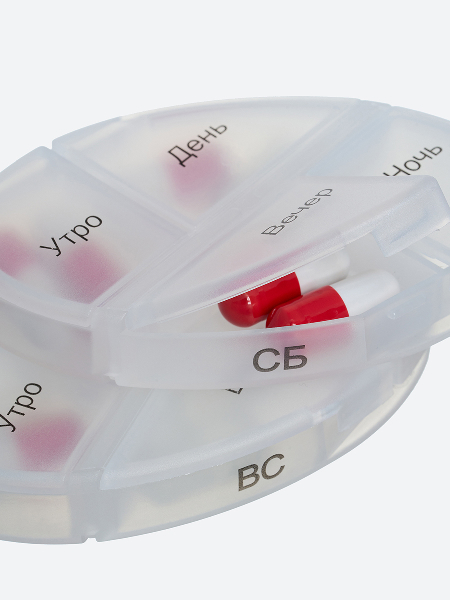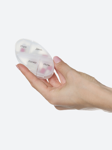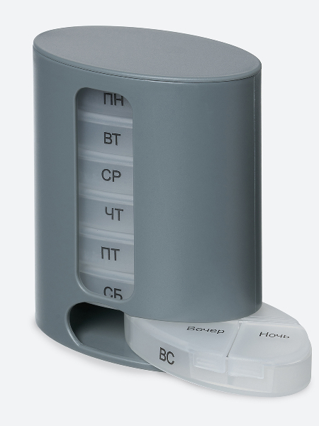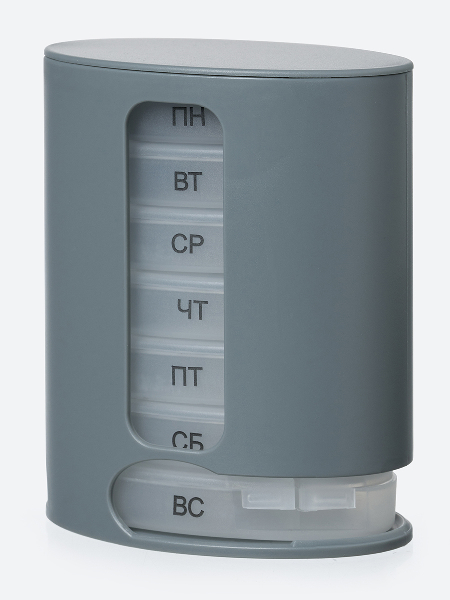 Контейнер для витаминов «ФОРМУЛА» - органайзер для пищевых добавок и лекарств на неделю. Помогает контролировать прием препаратов. В вертикальном контейнере семь овальных пеналов. Пеналы вынимаются на каждый день недели, в пенале 4 отделения. Дни недели маркированы на пеналах. Пеналы прозрачные.