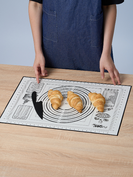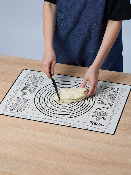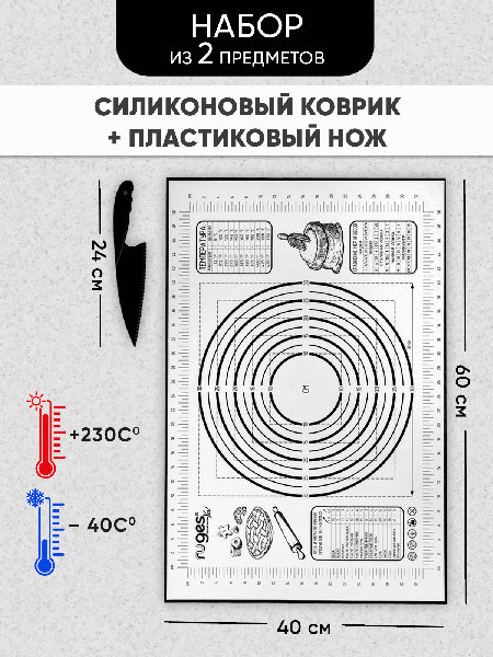 Полипропиленовый нож идёт в комплекте специально для того, чтобы резать тесто непосредственно на коврике, поскольку стальными ножами по силикону резать нельзя. Коврик на котором тесто можно раскатать, сформировать булочки или пирог и отправить в духовку на коврике же. Вот такой у нас БЕЙКЕР. Конечно можно и без него и кто-то обязательно назовет его излишеством и блажью. Ведь можно и по старинке: стол мукой посыпать, на противень все переложить, перемыть стол и противень - опять же польза. Просто наслаждайтесь! Потому что не надо досыпать муку - тесто не прилипает к БЕЙКЕР. И противень смазывать не надо - потому что на коврике БЕЙКЕР не пригорает и не пристает. И в холодильник его можно. Рекомендуем всем, кто любит готовить, печь и запекать.
