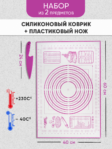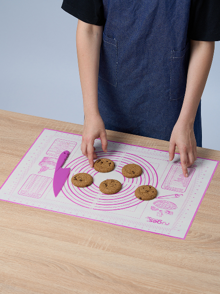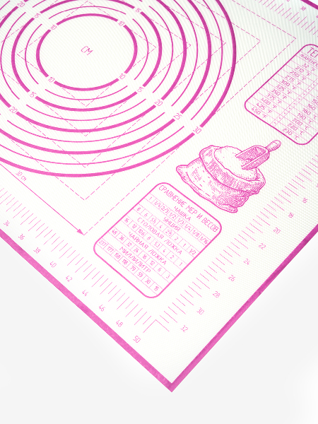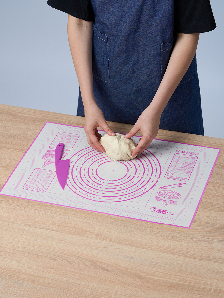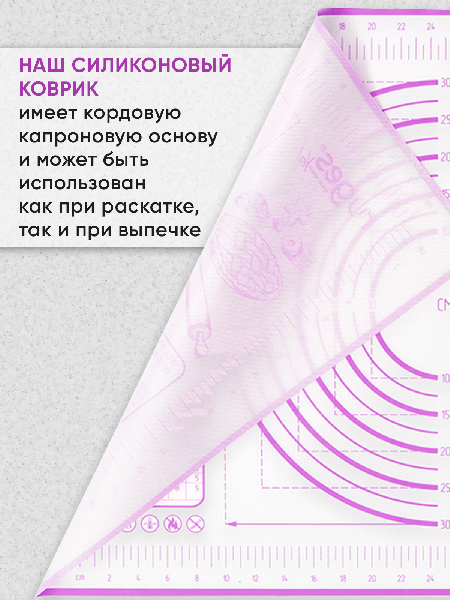 Внимание: наш коврик имеет кордовую капроновую основу которая позволяет и раскатывать и запекать в духовке. Коврик выдерживает температуру от -40 до +230 C. Полипропиленовый нож идёт в комплекте специально для того, чтобы резать тесто непосредственно на коврике, поскольку стальными ножами по силикону резать нельзя. Коврик на котором тесто можно раскатать, сформировать булочки или пирог и отправить в духовку на коврике же. Вот такой у нас БЕЙКЕР. Конечно можно и без него и кто-то обязательно назовет его излишеством и блажью. Ведь можно и по старинке: стол мукой посыпать, на противень все переложить, перемыть стол и противень - опять же польза. Просто наслаждайтесь! Потому что не надо досыпать муку - тесто не прилипает к БЕЙКЕР. И противень смазывать не надо - потому что на коврике БЕЙКЕР не пригорает и не пристает. И в холодильник его можно. Рекомендуем всем, кто любит готовить, печь и запекать.