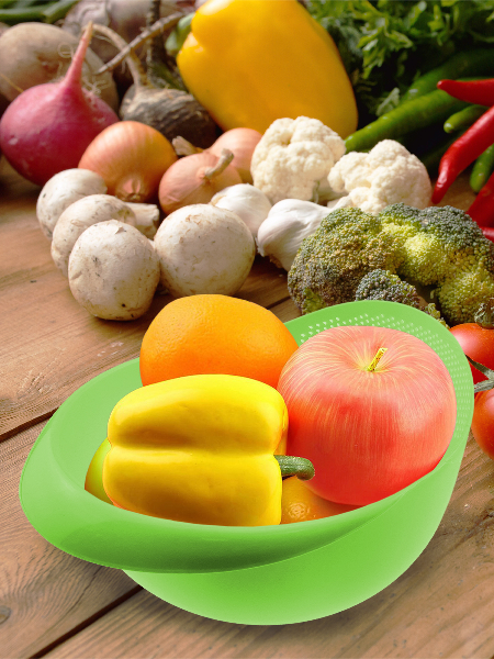 Миска в которую встроен дуршлаг - удобно и в использовании и в хранении и меньше посуды мыть.