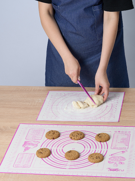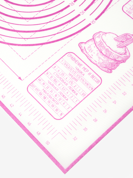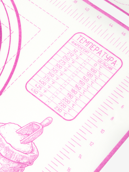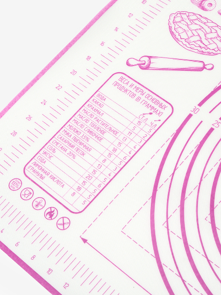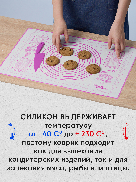 Коврик для раскатки теста имеет кордовую капроновую основу которая позволяет и раскатывать и запекать в духовке. Термостойкий коврик выдерживает температуру духовки +230C, также коврик можно использовать в холодильнике -40C. Подарочный нож для теста пластиковый идёт в комплекте для того, чтобы резать тесто непосредственно на коврике, поскольку стальными ножами по силикону резать нельзя. Кондитерский противоскользяший коврик на котором тесто можно замесить и раскатать, сформировать макарун, булочки или пирог и отправить в духовку на коврике. Кухонный коврик служит идеальной антипригарной поверхностью, к которой не прилипают кулинарные изделия во время запекания. Многоразовый коврик идеально моется и не впитывает запахи, плотно прилегает и не скользит. Универсальный коврик имеет разметку для разных вариантов раскатки теста. Размеры ковриков: большой 60х40х0,1 см (размерная шкала 50х32 см); маленький 40х30х0,1 см (размерная шкала 30х20 см); Размеры ножа: 24х5х1 см.