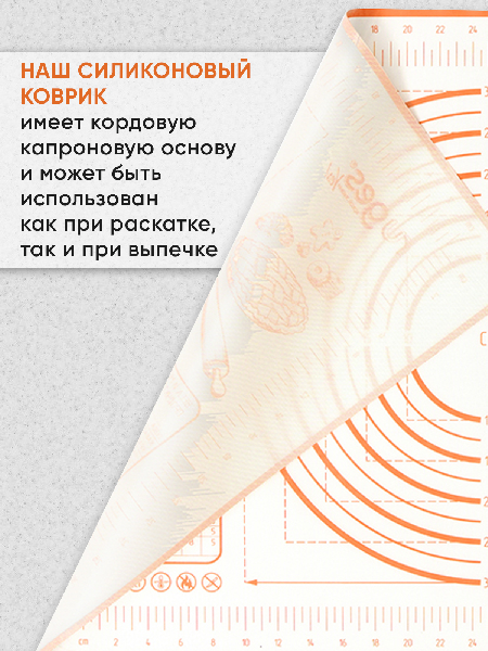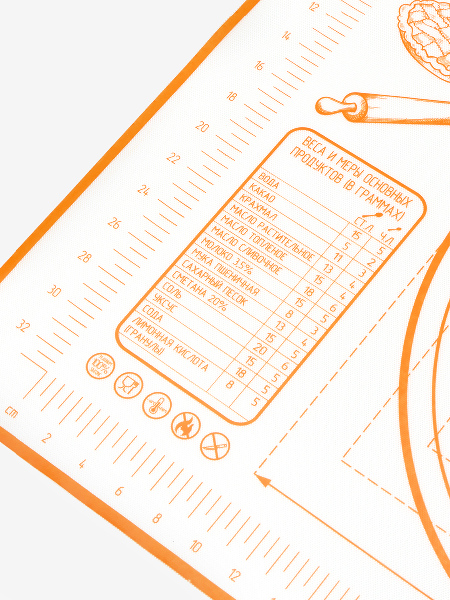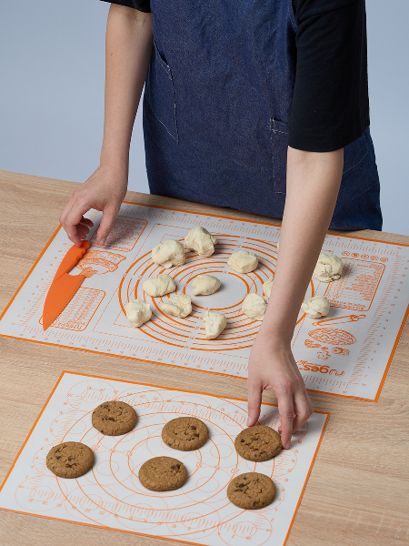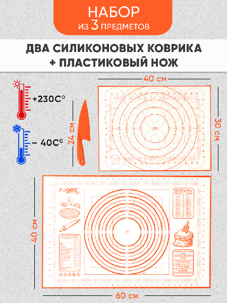 Коврик для раскатки теста имеет кордовую капроновую основу которая позволяет и раскатывать и запекать в духовке. Термостойкий коврик выдерживает температуру духовки +230C, также коврик можно использовать в холодильнике -40C. Подарочный нож для теста пластиковый идёт в комплекте для того, чтобы резать тесто непосредственно на коврике, поскольку стальными ножами по силикону резать нельзя. Кондитерский противоскользяший коврик на котором тесто можно замесить и раскатать, сформировать макарун, булочки или пирог и отправить в духовку на коврике. Кухонный коврик служит идеальной антипригарной поверхностью, к которой не прилипают кулинарные изделия во время запекания. Многоразовый коврик идеально моется и не впитывает запахи, плотно прилегает и не скользит. Универсальный коврик имеет разметку для разных вариантов раскатки теста. Размеры ковриков: большой 60х40х0,1 см (размерная шкала 50х32 см); маленький 40х30х0,1 см (размерная шкала 30х20 см); Размеры ножа: 24х5х1 см.