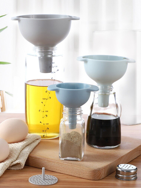Набор из трех кухонных леек плюс ситечко. Вы сможете пересыпать или перелить продукт даже в емкость с очень небольшим горлышком. Бонус: воронки помещаются одна в другую для удобства хранения. Легких решений вам!